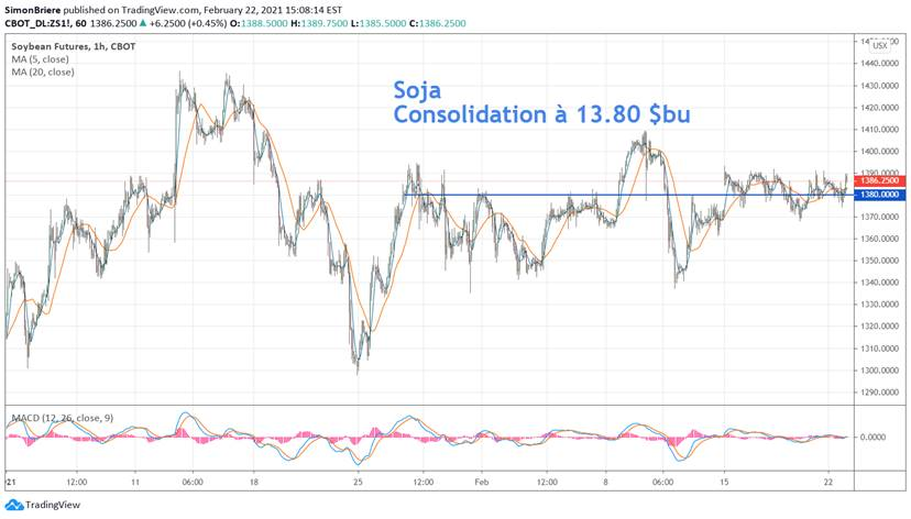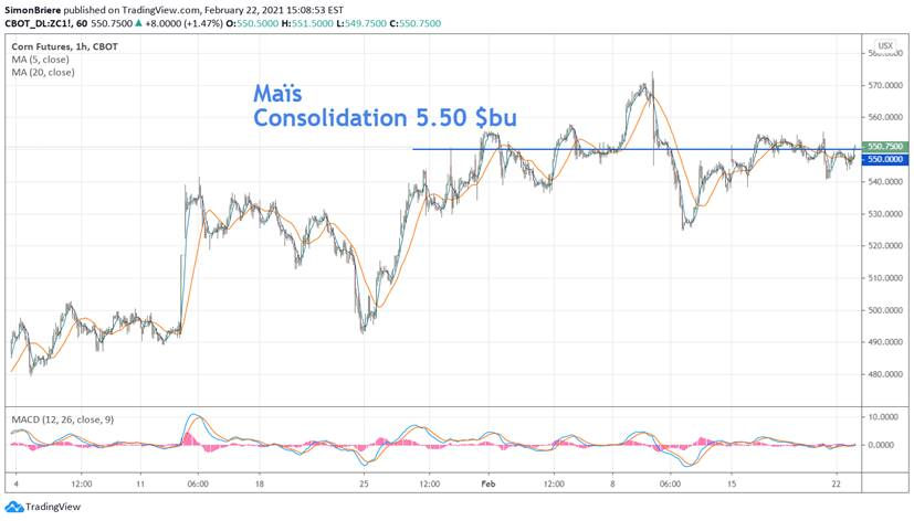 Ça fait presqu’un mois maintenant que les prix semblent se stabiliser dans le blé d’inde; ça tourne autour de 5.50 $bu et bien que la volatilité soit présente le prix cherche à rester autour de ces niveaux là quand même. Une pause avant de repartir à la hausse? Une pause avant de commencer à redescendre? J’ai un constat similaire dans les fèves, ça semble prendre une pause tout juste sous les 14$ le boisseau. Récemment c’est le blé qui montre le plus de force, notamment à cause de la potentielle réduction des exportations russes (taxe) et de la crainte de qualité avec les froids intenses la semaine dernière aux USA.