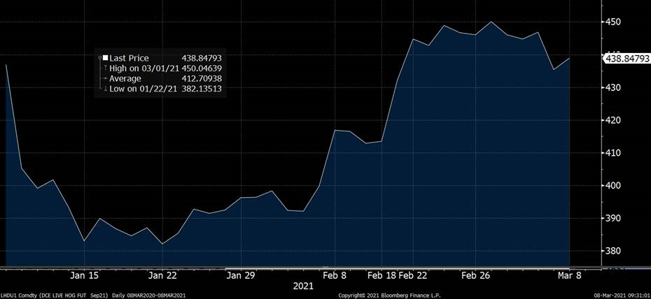 La semaine dernière, le contrat d’avril montrait des signes de plafonnement, mais pas de tendance baissière à l’horizon. Pendant ce temps, ce sont les échéances plus lointaines qui se sont appréciées, dont le contrat de décembre 2021 qui a gagné 2.5 cents pour terminer la semaine à 74.70 $US/100lbs ou 193 $CA/100kg. En voyant la force du cash pour cette période de l’année, ça donne de l’espoir de voir de bons prix tout au long de l’année et l’optimiste observé ses dernières semaines sur le contrat d’avril semble se propager sur les autres échéances. Un autre facteur expliquant le rebond des prix sur la 2ème moitié de 2021 est la propagation des cas de maladie porcine à travers la troupeau chinois, précipitant les abattages de porc au détriment des abattages futurs, mais les données sur l’état des maladies sont toujours nébuleuses avec le gouvernement. Ce dernier qui prévoit un retour du troupeau à la période pré-PPA d’ici juin, pendant que certains journalistes rapportent un désastre dans certaines régions… qui croire? En regardant le prix du contrats de porc en Chine, on voit que les prix pour la livraison de septembre sont stables depuis 2 semaines, à +/- 440 $US/100kg, donc il ne semble pas avoir de panique.