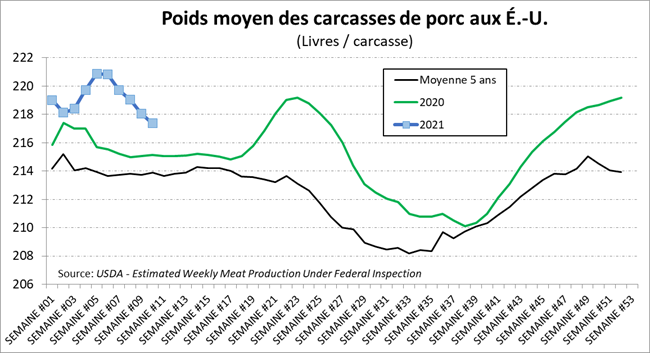 Concernant les abattages de la semaine dernière, les volumes sont plus faibles que les semaines précédentes, avec une production de 557 millions lbs, en baisse de 3.4% versus l’an dernier. Les abattages étaient de 2.56 millions têtes, en baisse de 4.4%, mais le poids continue d’être au-dessus de l’an dernier, possiblement encore pour quelques semaines, à 217.4 lbs/carcasse.