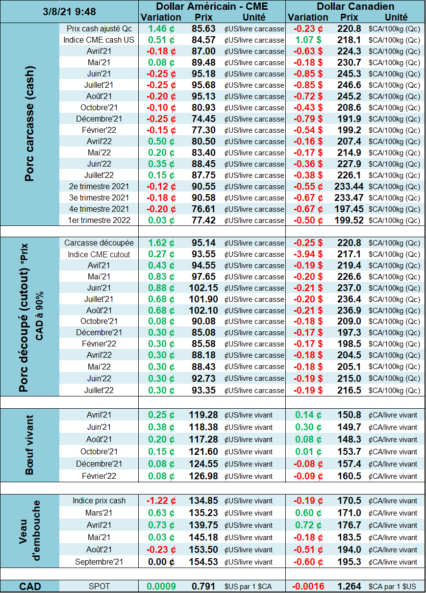 Du côté des États-Unis, l’USDA publiera en matinée les données d’exportation de janvier 2021. On s’attend tout de même à de bonnes exportations puisque la Chine a dévoilé ses importations de viande en janvier et février lesquelles étaient en hausse de 28% par rapport la même période l’an dernier.