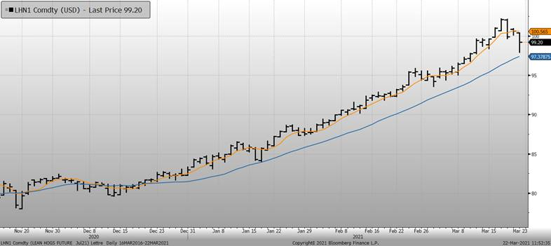 Du côté de la Chine, le prix cash continue de baisser pour atteindre son plus bas niveau depuis septembre 2019 à 27 CNY/kg, soit une baisse de 26% depuis le début de l’année. On ce moment, ce n’est pas facile d’obtenir l’heure juste sur le troupeau chinois. D’une part, le ministère de l’agriculture a rapporté une augmentation du cheptel de truies par 1.1 et 1.0% en janvier et février respectivement, ce qui mettrait le cheptel de février à 95% de celui de 2017 (avant PPA). D’autre part, Rabobank parle d’une baisse de 3 à 5% du cheptel de truies par mois depuis décembre (donc une baisse d’environ 10 à 15% depuis le début de l’année). Aussi, la firme de consultation chinoise Yongyi chiffre la baisse du cheptel de -5.0% en janvier et -4.7% en février. Qui dit vrai!?