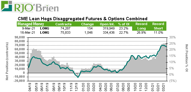 Concernant la position des spéculateurs, entre le 10 et 16 mars, ils ont ajouté 1,546 contrats en achat. Même si leur position est plus grosse qu’avant, elle est plus modeste relativement au marché : elle est passée de 23.2% à 22.7% des contrats existants en raison que les vendeurs (éleveurs) prennent de plus en plus de positions. Ils existent donc plus de contrats existants à Chicago (334,000 vs 320,000 contrats).