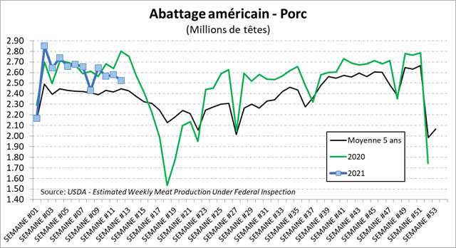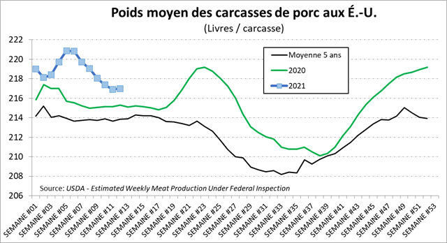 La semaine dernière, les abattages étaient nettement en dessous du volume de l’an dernier, mais ça va devenir de plus en plus difficile d’avoir une idée claire de l’offre de porc en comparant avec 2020 à cause des perturbations que la COVID aura causée sur les données de 2020. Somme toute, les abattages de la semaine dernière demeure relativement faibles avec 2.52 millions têtes, en baisse de 9.8% versus l’an dernier. On voit que l’offre de viande de porc est limitée pour l’instant ce qui s’illustre bien dans les prix cash et cutout. Le poids demeure élevé à 217 lbs/carcasse, mais ça ne compense pas pour la baisse des abattages. La production hebdomadaire a atteint 547.7 millions lbs.