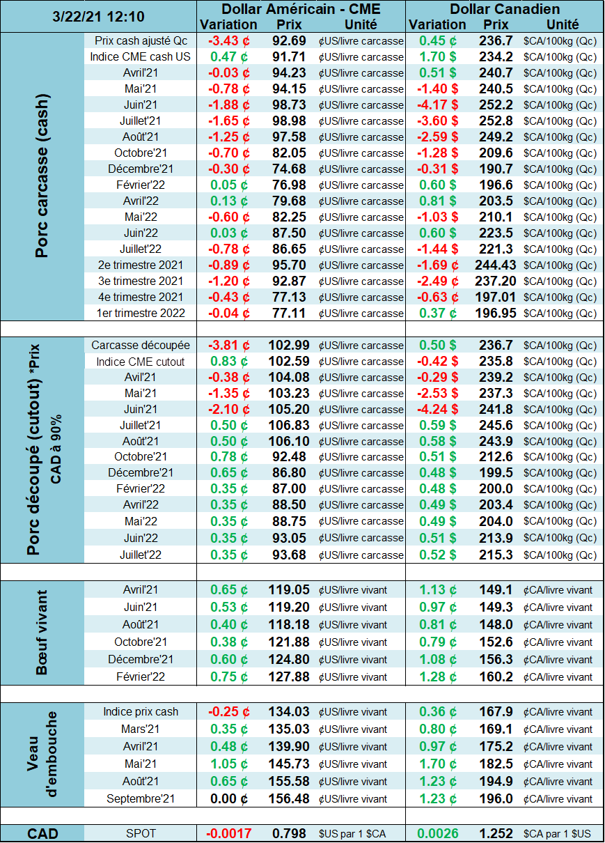 Techniquement, le prix semble avoir plafonné sur les échéances d’été, mais le cash demeure assez fort. Pour ceux qui détienne encore des positions vendeurs sur avril, il serait à considérer de rouler la position sur une échéance plus loin avant de voir les spreads se resserrer d’avantage. Dans les prochaines semaines, le contrat d’avril va aller s’enligner avec le prix cash ce qui limite le potentiel baissier sur cette échéance alors que les autres contrats vont continuent de fluctuer selon l’appréhension du marché. D’ailleurs, il est intéressant de voir que le contrat de mai se transige en-dessous du prix d’avril ce qui démontre que le consensus du marché est une baisse de prix dans quelques semaines… bien que l’écart est très petite pour l’instant. Cependant, si on apprend cette semaine que les inventaires surgelés se reconstruisent assez vite ou bien que le cheptel de porc américain est plus gros que prévu, on peut s’attendre à voir les prix baisser à Chicago, sauf le mois d’avril.