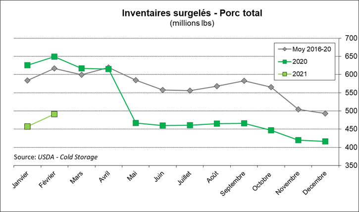 - Inventaires de porcs à 491 millions lbs : les plus élevés depuis avril 2020, mais la reconstruction est lente. Seulement +33 millions lbs en inventaire versus janvier (+7%), mais on demeure 24% sous l’an dernier. À ce rythme, on pourrait envisager un retour à la normale (600 millions lbs) vers avril-mai.