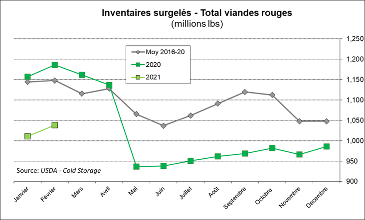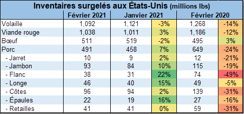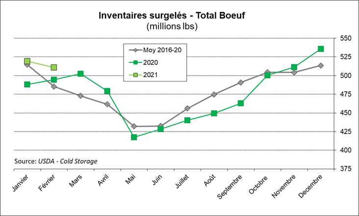 - Bœuf : 511 millions lbs, peu de changement versus janvier 2021 et février 2020