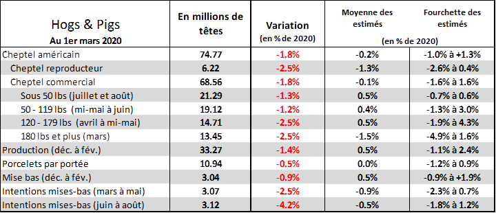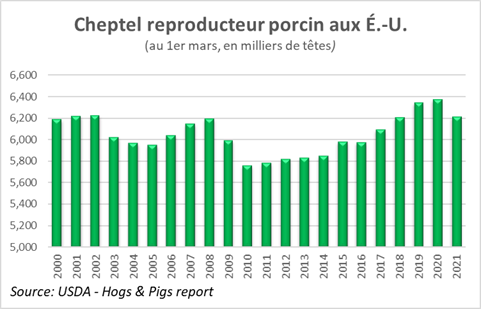 Sur tous les points, le rapport s’avère positif pour les prix avec moins de porcs que prévus. Vraisemblablement, l’été 2020 a été difficile dans l’élevage aux États-Unis causant une baisse des inséminations il y a 9 mois et par conséquent, moins de porcs. Malgré la hausse du prix du porc cet hiver/printemps, le cheptel de truie a diminué entre le 1er décembre 2020 (6.28 M truies) et le 1er mars 2021 (6.22 M truies), soit 2.5% de moins qu’au 1er mars 2020. Il faut dire que les prix au comptant des derniers mois ne s’est pas nécessairement reflétés en profit en raison du coût de la moulée ce qui pourrait expliqué la liquidation du cheptel.