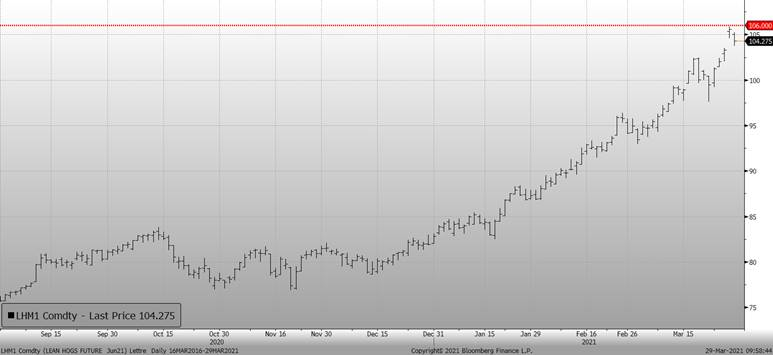 Encore une fois, l’optimisme régnait sur le marché à terme du porc la semaine dernière, alors que les prix au comptant atteignent de nouveaux sommets depuis la DEP en 2014. Il faut dire que le marché cash est très « hot » présentement et l’USDA le confirmait la semaine dernière avec un plus petit troupeau que prévu ainsi que des stocks surgelés qui se reconstruisent lentement. Possiblement que l’offre de viande limitée n’aide pas à la reconstruction des stocks. Ce matin, le marché semble plafonner suite à une baisse de -1.5 cents sur les mois d’été, mais il est encore trop tôt pour parler d’un changement de tendance. Pour quelqu’un qui voudrait vendre ce matin, je trouve le point d’entrée intéressant pour vendre, mais en mettant un stop loss à 106 cents sur juin, limitant la perte si le marché continue de remonter plus tard cette semaine.