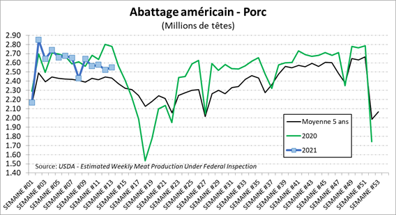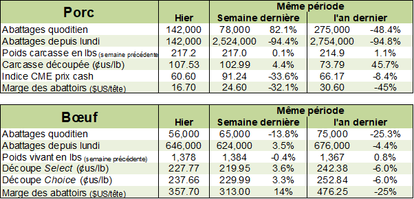 En ce qui attrait à la disponibilité de la viande, il y a belle et bien une contraction lorsqu’on compare à l’an dernier. Les abattages de 2.55 millions porcs représentent une baisse de -8.2% versus l’an dernier et la production de 554 millions lbs est -7.2% versus l’an dernier. Ça fait une deuxième semaine consécutive que les chiffres de production sont nettement inférieurs à l’an dernier, mais il ne faut pas oublier que les abattages étaient très fort l’an dernier à cette période de l’année, avant de chuter en avril. Si on compare avec 2019, on parle d’une hausse des abattage de +1.9% et une augmentation de la production par +3.3%.
