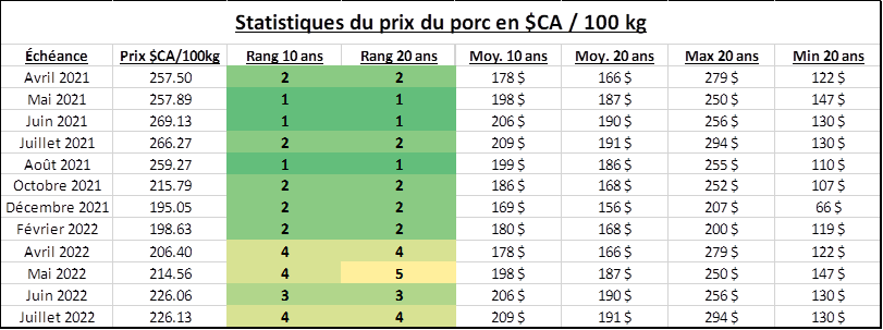 Du côté de la Chine, on continue de voir le prix cash baisser suggérant que l’offre de viande revient graduellement à la normale. Le prix cash de 26 CNY/kg, soit l’équivalent de 396 $US/100kg. Depuis le début de l’année, le prix cash du porc en Chine a baissé de l’équivalent de 170 $US/100kg.