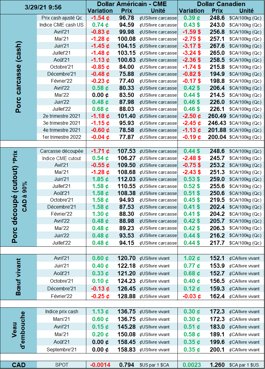 Il faut dire que le marché cash performe très bien, on fait face à une forte demande locale alors que l’offre est « limité » mais il ne faut pas non plus paniquer puisque la production de viande reste bonne. Le prix cash aux États-Unis est de 95 cents/lb ce qui est le plus haut prix depuis l’automne 2014. Le cash suit simplement la valeur de la carcasse découpée qui a atteint un sommet mercredi à 110.5 cents/lb, grandement aidé par le jambon et le bacon.