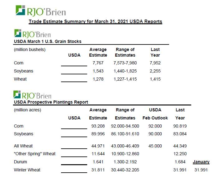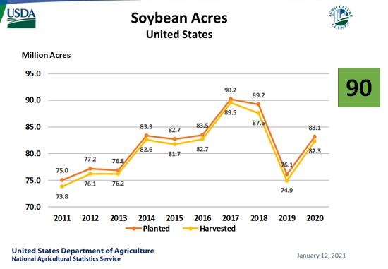 - Soybeans: prévisions de 90 millions d’acres, en hausse de 7M vs 2020