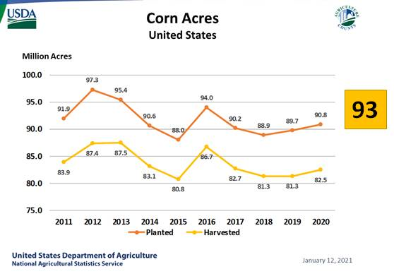 - Maïs: prévisions de 93 million acres, en hausse de 3M vs 2020