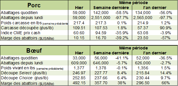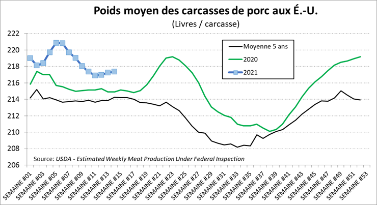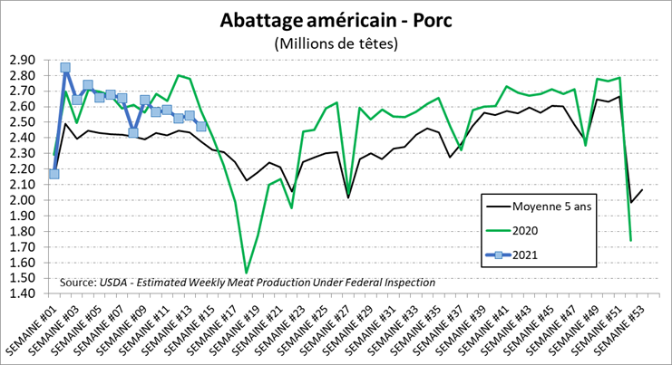 La semaine dernière, les abattages étaient de 2.47 millions porcs, soit 4% de moins que l’an dernier, mais en ligne avec les abattages de 2019. Le poids demeure élevé par +1.2% à plus de 217 lbs/carcasse ce qui vient tempérer la baisse de la production hebdomadaire. Cette production était de 536.9 millions lbs, soit 2.9% de moins qu’en 2020 mais 1.6% de plus qu’en 2019.