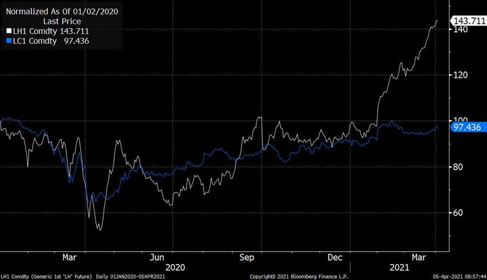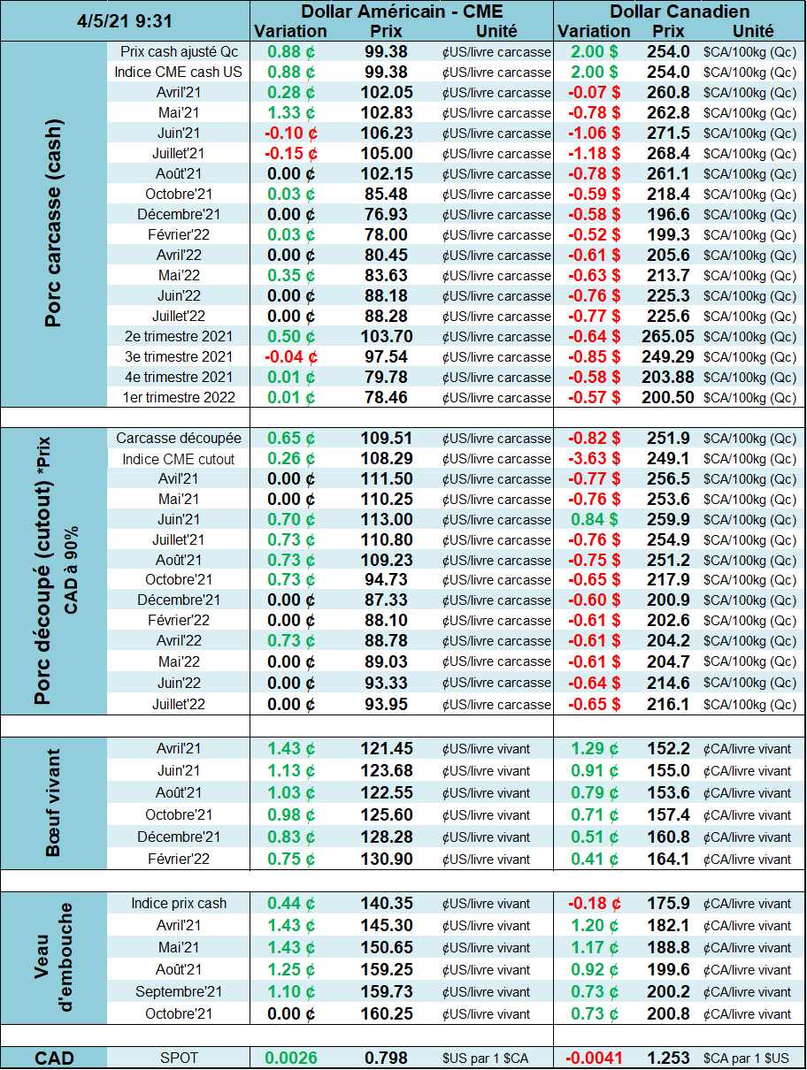 La semaine dernière ne fût pas si différente des semaines précédentes avec les contrats de porc qui ont atteint un nouveau sommet. Le prix cash a gagné 1.7 cents au courant des 4 dernières journées ce qui montre des signes de ralentissement, mais la tendance haussière demeure. Maintenant que le prix cash surpasse les sommets des 6 dernières années et avoisine la piastre, il sera intéressant de voir si la demande restera aussi forte. Notamment la demande locale qui est difficilement quantifiable et semble être à la base de la flambée des prix. On sait que les inventaires surgelés sont faibles et que ça prendra quelques mois avant d’être revenu à un niveau « normal » ce qui devrait donner un support au prix pour encore quelques semaines.