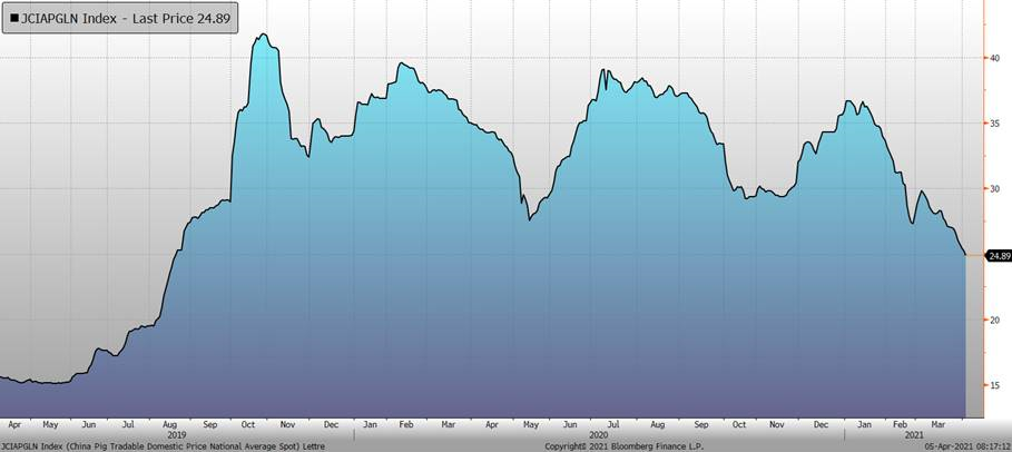 Concernant la demande extérieure, on continue de suivre ce qui se passe en Chine. Une vague épidémique de peste porcine africaine cette année a anéanti au moins 20% du cheptel reproducteur dans le nord de la Chine, ont déclaré des sources de l'industrie et des analystes, dépassant les pertes attendues et faisant craindre un impact potentiel supplémentaire dans le sud. Les estimations indiquent l'ampleur de la résurgence de la maladie au premier trimestre de 2021 après plus d'un an de cas en baisse, annonçant un recul significatif des efforts de la Chine pour reconstituer ses troupeaux de porcs après que la peste porcine africaine a atteint le pays en août 2018 et a disparu 50% des porcs du pays en un an. Cependant, l’impact des nouvelles éclosions de PPA affectera d’avantage la production prévue pour la fin 2021 et en 2022 puisque les abattages des prochaines semaines/mois proviennent du cheptel reproducteur de l’an dernier. Autrement dit, on peut s’attendre à ce que la production de viande continue à croître en Chine malgré la PPA puisqu’on bénéficie aujourd’hui des efforts de reconstruction de l’an dernier, mais cette croissance devrait ralentir en raison de ces nouveaux cas. Notez que le gros de la production chinoise est au centre-sud du pays (Sichuan, Henan, Hunan et Hubei) et que les provinces productrices les plus au nord sont le Shandong et le Hebei (4ème et 7ème producteur en importance, respectivement). Ça revient à dire que l’impact des nouveaux cas de PPA sur la production nationale n’est pas encore alarmante étant donnée que les régions du sud sont moins contaminées, pour l’instant.