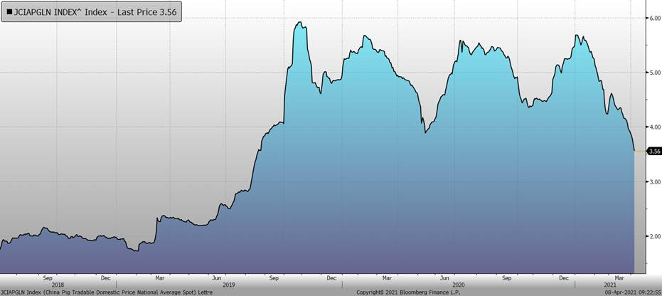 Reuters sortait récemment la nouvelle comme quoi la fièvre porcine africaine avait décimé 20% du cheptel reproducteur porcin dans le nord de la Chine au cours du premier trimestre de 2021. Un rapport de la firme de recherche Founder Cifco Futures mentionne que la province de Henan, par exemple, avait perdu entre 20% à 30% du cheptel reproducteur. La firme Beijing Orient Agribusiness Consultant Ltd. affirme la même chose pour tout le nord de la Chine. Le Ministère chinois de l’Agriculture et des affaires rurales ne confirme ni n’infirme ces nouvelles.