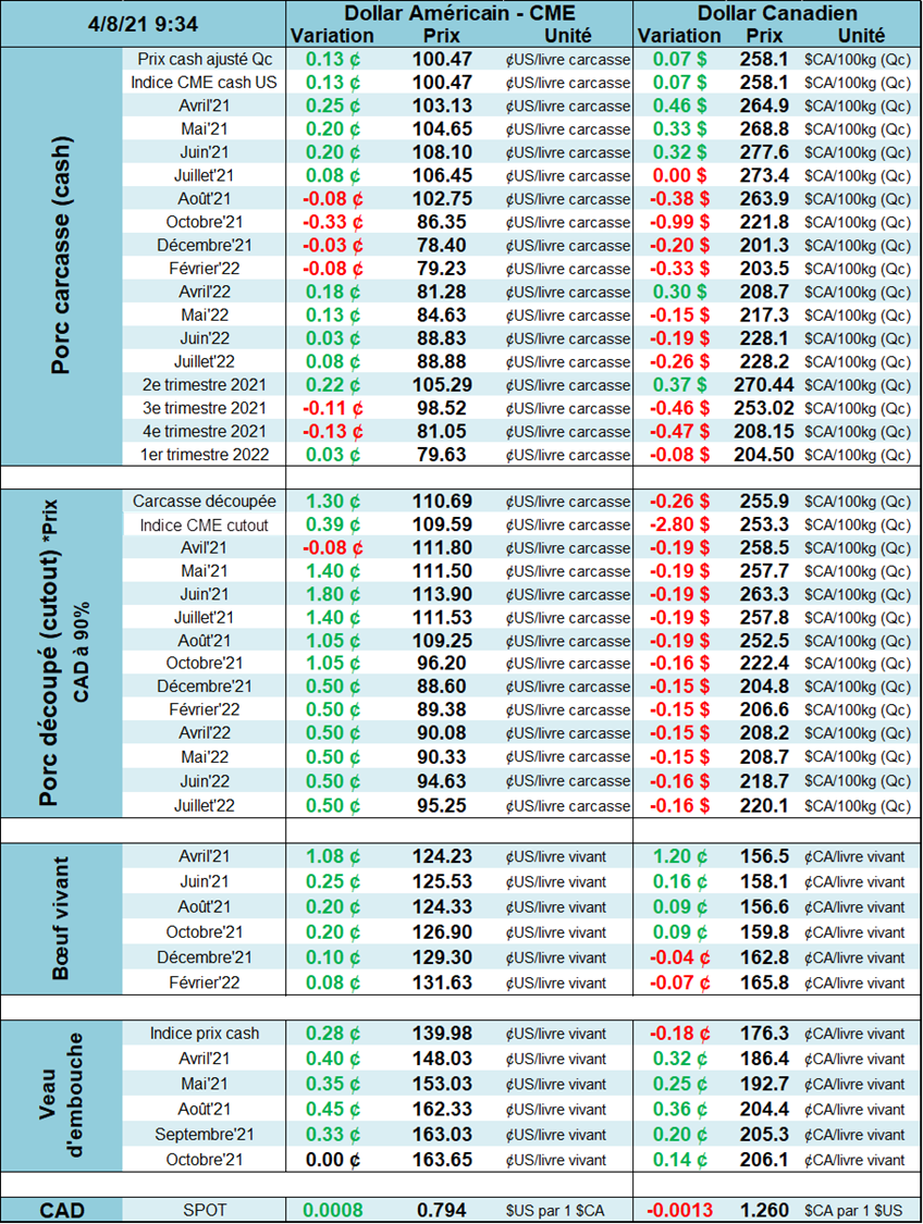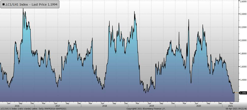 Un autre point important, en Amérique du Nord on sent vraiment l’effet de la réduction des cheptels qui s’est produit en 2020 en raison de la Covid. La baisse du cheptel reproducteur au cours de l’année dernière et les pertes financières des producteurs à fini par créer un trou de production à un moment où les consommateurs ne semblent pas réaliser encore que les prix de la découpe approche de prix rarement vus. Il est intéressant de rappeler que les écarts entre les prix du bœuf et du porc sont très minces. Et encore une fois, comment le consommateur réagira-t-il à la vue de tels écarts dans le commerce de détail? Il n’est pas certain que ceux-ci regardent véritablement ce genre de chose. La grande majorité des consommateurs nord-américains sont dans une position enviable au niveau de leurs finances personnelles malgré la pandémie et le porc demeure une viande consommée davantage à la maison (alors que le bœuf est une viande de resto). Et comme, on reconfine à plusieurs endroits en Amérique du Nord, la demande demeure forte pour la viande de porc.