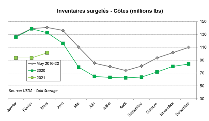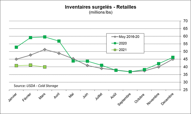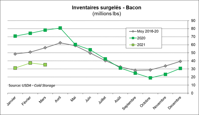 Les inventaires de bacon sont très faibles (-55% vs 2020) ce qui est très favorable pour le prix considérant la forte demande estivale qui est à nos portes. L’ensemble des coupes de porc sont environ 30% en-dessous des quantités de l’an dernier, à l’exception du la longe de porc qui est stable à près de 50 millions lbs.