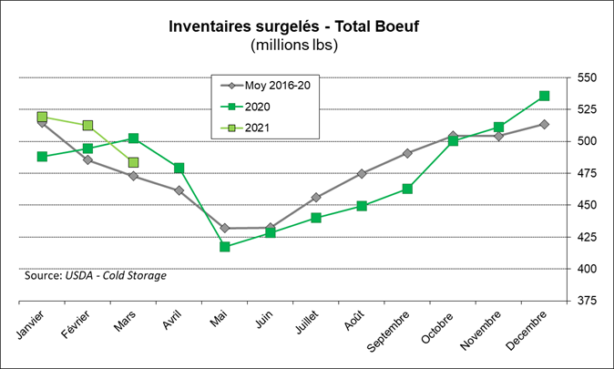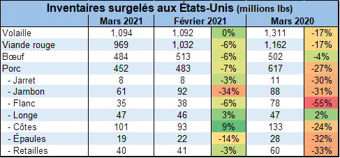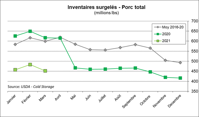 Hier, l’USDA publiait le rapport mensuel des inventaires surgelés. Alors qu’on parlait d’une reconstruction des inventaires surgelés en 2021, particulièrement dans le porc, le rapport nous démontre le contraire. En plus de revoir les stocks du 28 février à la baisse, les inventaires surgelés au 31 mars affichent une diminution mensuelle pour le porc et le bœuf, il y a seulement les inventaires de volaille qui ont resté stables durant le mois de mars.