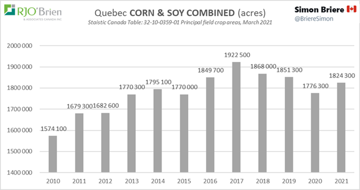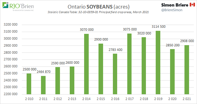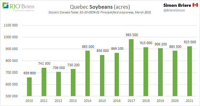 - Soja: 2.9 millions d’acres en Ontario et 923 milles au Québec