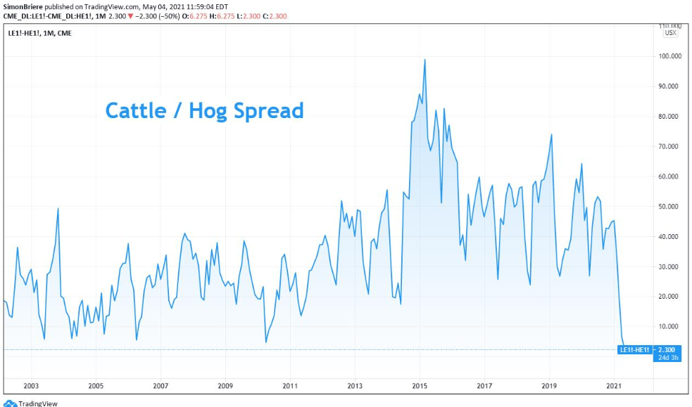Pour ceux qui s’intéressent aux prix du porc versus le bœuf. Un écart de prix presque historiquement bas….(20 ans!)