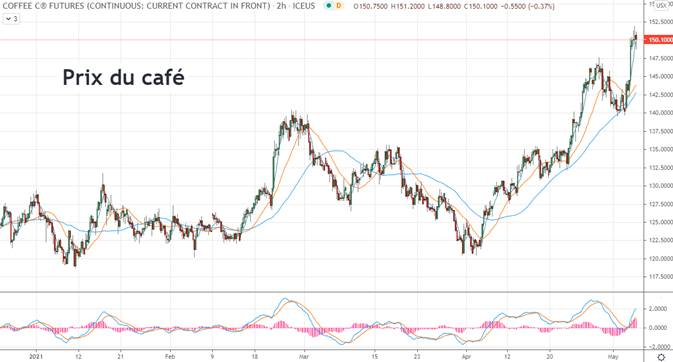 La météo au Brésil n’est vraiment pas idéale, c’est beaucoup trop sec et peu/pas de précipitation dans le cartes. À chaque jour qui passe, et qu’il n’y a pas d’eau, la bourse réagit… Un élément qui tend à valider la situation météo au Brésil c’est de regarder ce qu’il se passe avec le café. Ce n’est pas une science exacte, mais puisqu’ils en produisent beaucoup à chaque année donc ça peut devenir un indicateur qui corrobore en partie. Depuis un mois, le prix du café est en hausse de 25%. Ce n’est probablement pas uniquement due à la météo au Brésil car la demande s’ajuste aussi avec la réouverture des économies. Je me demande…. si une feuille de plywood vaut 100$ au centre de rénovation j’imagine que le café fancé en ville va bien valoir 10$ un bon moment donnée! L’inflation, tsé.