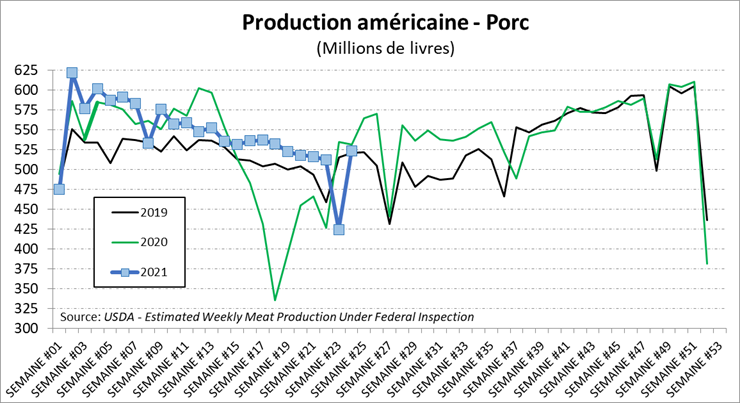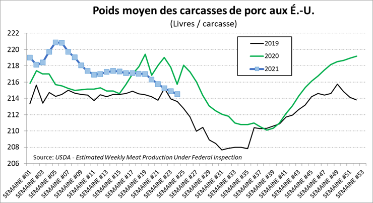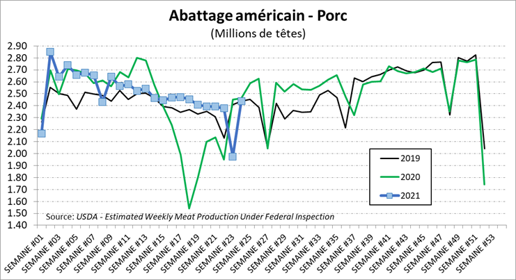 Le nombre de porcs abattus se situe à 2 440 000 têtes la semaine dernière. Le rythme d’abattage se maintient entre 2,4 et 2.5 millions de bêtes / semaine. Cette situation demeure supérieure au rythme d’il y a 2 ans. (il est difficile de comparer l’an dernier en raison de la situation des abattages).