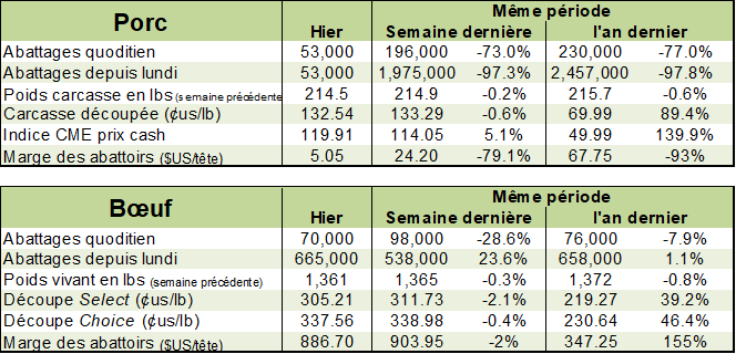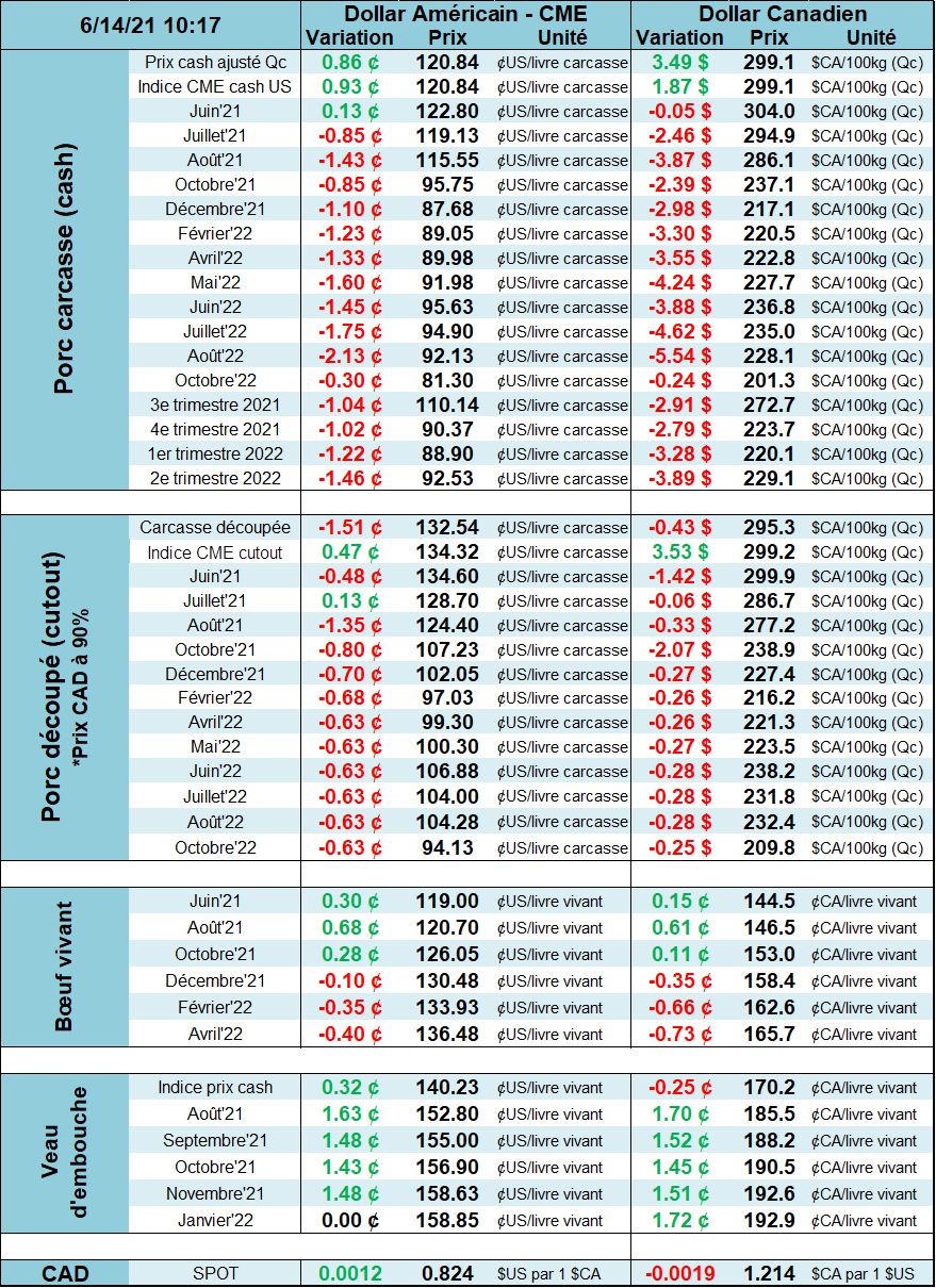 Le porc sera probablement dans une situation plus fragile cette semaine. En effet, si le prix des grains avait aider le prix du porc à grimper jusqu’à tout récemment, il est logique de penser que celui-ci devrait baisser si les intrants retombent sur Terre. Autre chose, le prix de la découpe vendredi midi montrait une hausse de plus de 6 cents / livre, mais le USDA a rapporté que le prix officiel en fin de journée se situait plutôt en baisse de 1.51 cents / livre. Le prix termine tout de même la semaine à $132.54 USD / 100 livres.