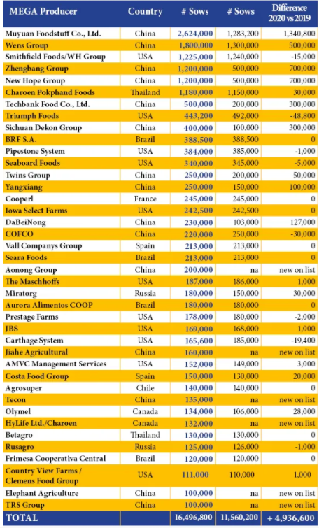 Il faut absolument revenir sur la situation en Chine. Il y a un article fort intéressant de Jim Long de Genesus sur les Internets! La firme Genesus a compilé certaines informations qu’elle a colligé elle-même. Par conséquent, les chiffres ne sont pas officiels, mais il est tout de même intéressant d’y jeter un œil. En fait, ces chiffres montraient tout l’étendue du nombre de truies que possèdent les Méga-producteurs de porcs (40 compagnies) du monde. Ce qui frappe c’est surtout la présence des mega-producteurs chinois qui occupent presque toutes les places du tableau. Mais ce qui devraient aussi transpercer votre écran ce sont les hausses du cheptel de truie entre 2019 et 2020. Le nombre de truies pour ces joueurs chinois ont augmenté considérablement entre la fin de 2019 et la fin de l’année 2020. Imaginez un seul instant doubler le nombre de truies en passant de 1.3 millions à 2.6 millions! Plusieurs joueurs ont doublé le nombre de truies pendant la dernière année. C’est vrai qu’elles avaient perdu une grande quantité du cheptel reproducteur pendant la crise de la fièvre porcine africaine. ll faut aussi noter la présence de nouveaux grands joueurs chinois qui ont été créés de toute pièce par l’État Chinois à coup de milliards de yuan investis dans la production.
