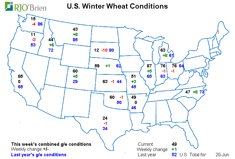 - Conditions blé d'hiver 48% bonnes/excellentes vs 48% attendues (46-51% gamme d'idées), 48% la semaine dernière, 50% l'an dernier