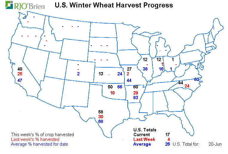 - Récolte de blé d'hiver 17% achevée vs 16% attendue (plage d'idées 12-25%), 4% la semaine dernière, 27% l'an dernier, 26% de moyenne