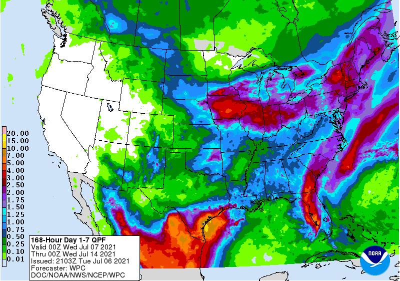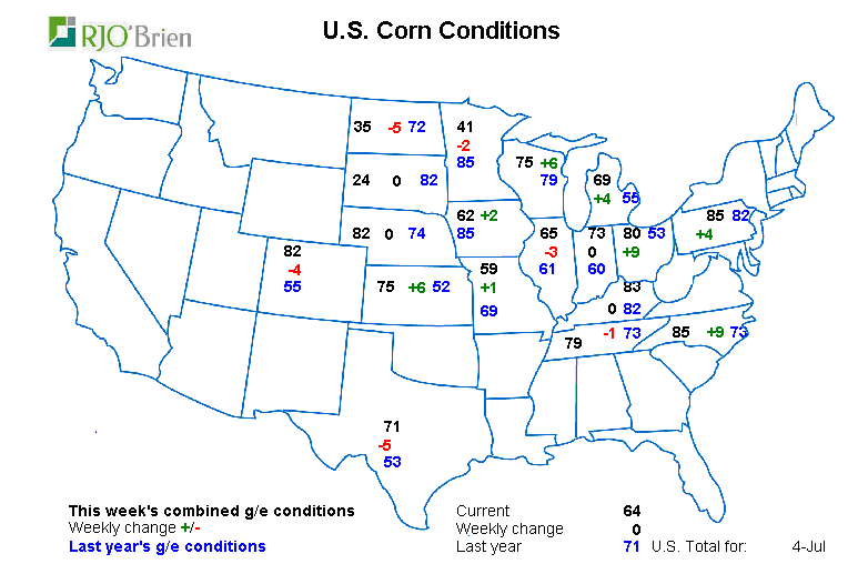 Le rapport USDA de la semaine dernière a pourtant fait peur au marché avec une augmentation de superficie bien en dessous des attentes ce qui place BEAUCOUP de pression sur le rendement afin de maintenir des inventaires "adéquat" à l'automne. La pluie annoncée cette semaine calme les ardeurs et le marché n'a pas plus autant peur d'une sécheresse. Ca ne garantie pas un rendement record, mais la météo actuelle/annoncée permet de souffler un peu parce qu'on retenait pas mal tous notre souffle!