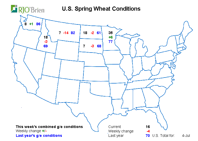 Honnetement, je ne sais pas qu'est-ce qu'il va arriver avec le blé de printemps (panifiable) puisque seulement 16% est de bonne/excellente condition. J'ai été surpris de la forte baisse aujourd'hui. M'enfin. C'est un désastre je ne sais pas ce qu'il va sortir de cette récolte là en terme de rendement ou production. Et c'est très dur à remplacer comme céréale (indice de chute, protéine, etc...). Ca peut devenir un réel probleme de prix et/ou logistique pour nos boulangers. Le Canada n'a pas de tariff à l'export comme le fait la Russie quand les inventaires locaux sont faible. Ici, on exporte, peu importe, pis on s'arrange avec nos trouble...? Le canola aussi fait pic-pic mais pour les huiles végétales on peut (dans une certaine mesure) aller chercher ailleurs - comme l'huile de soja ou l'infame huile de palme. En fait, tout ce qui est dans les prairies a l'air du y'able : blé printemps, canola, avoine, orge, etc... Le casse-tete de grain au Canada n'a pas l'air fini....