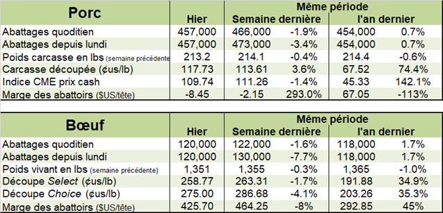 Premièrement, le prix au comptant qui semble avoir freiné sa chute des 3 dernières semaines. Le CME Cash se situait à 110.45 USD / 100 livres en hausse de 0.74. C’est une première hausse depuis la mi-juin. Deuxièmement, la découpe fait aussi une remontée pour finir hier à 117.73 USD / 100 livres. Le bacon revient près de 2.00 USD / livre après avoir chuté à moins de 1.45 USD / livre il y a 2 semaines de cela. En fait, le Dailylivestock report rapportait que toutes les viandes avaient atteint des niveaux de prix très élevés cet été et que les prix commencent à peine à décliner en fin de semaine dernière. Le prix de poulet (ailes de poulet entre autre) demeure sur des sommets de même que les prix de l’agneau et mouton. Certains coupes de bœuf sont aussi très élevées malgré la chute récente ces derniers jours. Bref, les viandes ont la cote ces temps-ci auprès de la clientèle.