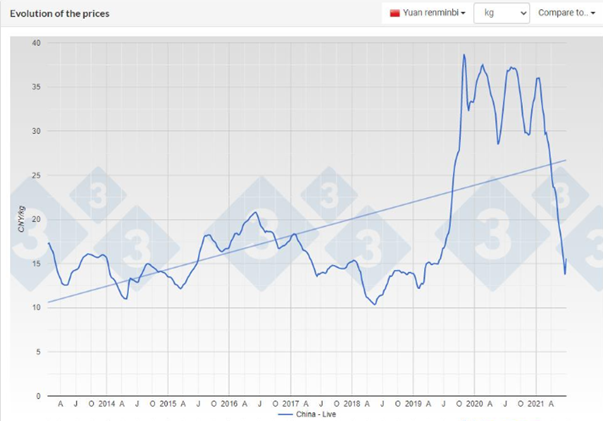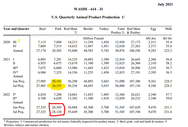Le USDA a publié un rapport de grain hier. Il faut souligner que dans ce rapport il y a toujours une petite section consacrée aux viandes. Finalement, l’organisme américain a révisé à la baisse la production porcine prévue pour 2021 la réduisant de 40 millions de livres. Mais aussi ce qui surprend le plus, c’est la révision pour 2022 : baisse de 425 millions de livres. Quand on y pense sur une base carcasse c’est tout de même presque 2 000 000 cochons en moins prévus pour 2022. Cela représente 1 semaine d’abattage!