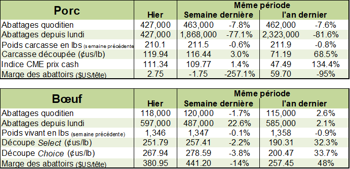 La production de porc de la semaine dernière demeurait faible aux États-Unis, à peine en ligne avec la moyenne quinquennale. Évidemment, les chiffres de 2020 sont gonflés par le rattrapage des porcs en attente du printemps 2020, mais on ne peut pas nier que la production des dernières semaines est en deçà des prévisions du Hogs & Pigs de juin. Alors que l’USDA dévoilait un troupeau 1.5% plus faible qu’en 2020 au 1er juin pour les porcs de 120-179 lbs, on voit les abattages être 9.4% en dessous du volume de l’an dernier avec 2.28 millions têtes. Le poids est similaire à l’an dernier ce qui donne une production 479 millions de livres.