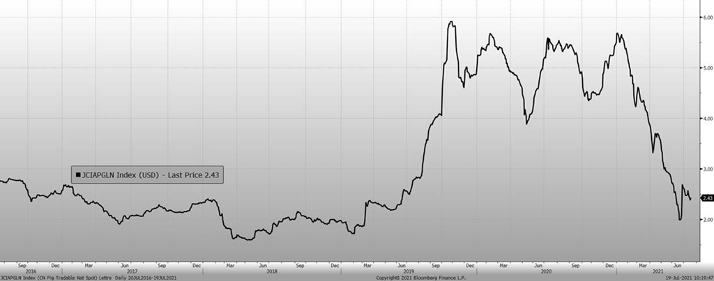 Ses annulations d’exportation sont possiblement expliquées par le fait que la Chine ne manque pas de viande de porc. La production chinoise de porcs au 2ème trimestre a été de 13.46 millions de tonnes, soit 40% de plus qu’à pareille date l’an dernier et à un record depuis au moins les 7 dernières années. La croissance de la production provient du démarrage de plusieurs nouveaux sites des principaux producteurs chinois et faut s’attendre à ce que la croissance continue puisque d’autres sites sont toujours en construction. Cette augmentation de production explique la chute du prix cash en Chine, baissant d’environ 150 $US/100kg durant le 2ème trimestre. Présentement, le prix est à 243 $US/100kg, en ligne avec les prix pré-PPA.