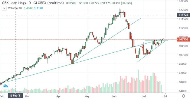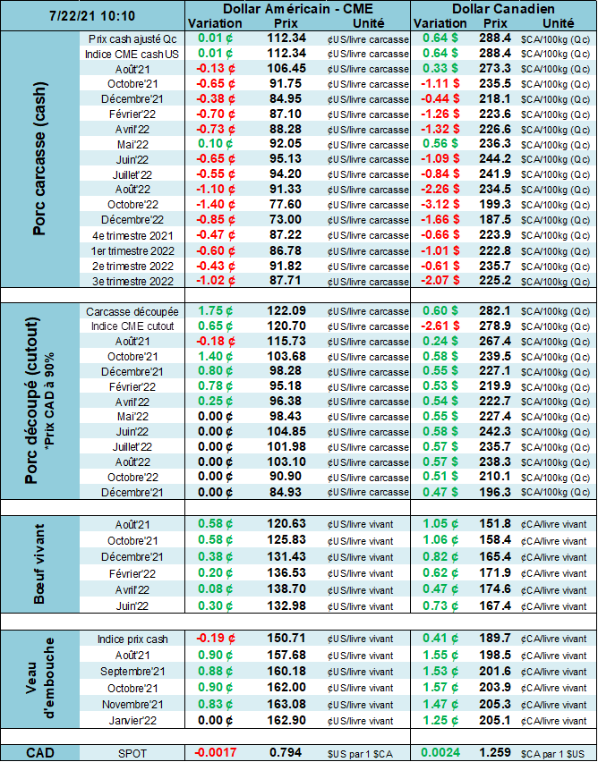Les contrats à terme dans le porc montrent toujours le même enthousiasme. Les prix remontent près des zones de résistances (voir mois août 2021). L’objectif technique se situerait autour de $110.00 soit près de la fenêtre baissière du mois de juin. Si le contrat ne parvient à traverse sa résistance de $106.95, le contrat pourrait retraiter vers le niveau de $104.00. Ce sont des journées importantes pour déterminer le prochain mouvement des prix.