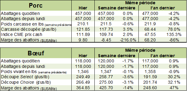 Le USDA rapportait que les exportations américaines se situaient à 24 500 tonnes métriques. Ce n’est pas impressionnant comme chiffre, mais cela demeure dans la moyenne des dernières années. Le Mexique prenait presque la moitié de cette quantité, la Chine annulait 100 tonnes. Il faudra s’habituer à voir la Chine absente des données hebdomadaires.