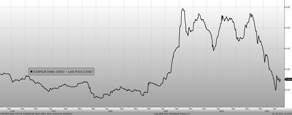 Reuters rapportait cette semaine que la Chine avait produit la plus grande quantité de viande de porc un 2ieme trimestre depuis les 7 dernières années. Le pays aurait produit 13.46 millions de tonnes de viandes pendant la période d’avril à juin 2021 (hausse de 40% par rapport à T2 2020). Il faut noter que cette période est en général le moment où il se produit le moins de porc en Chine… Les experts sont cependant d’accord que cette année est une anomalie statistique et que la cadence de production devrait ralentir durant le 3ieme trimestre de 2021.