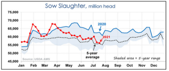 En regardant l‘offre de viande, les données d'abattage de l'USDA indiquent que l'abattage des porcs de juin à août était environ 7,0 % inférieur à 2020 et était également inférieur au niveau de 2019. Sur la base du rapport d'inventaire du 1er juin, l’abattage trimestriel aurait dû rouler à moins de 3 % en-dessous des abattages d'un an plus tôt. Selon l'USDA, le 1er juin le troupeau de porcs pesant 120 livres ou plus n'était que 1,5 % de moins qu'il y a un an et la quantité de porcs pesant moins de 120 livres était moins de 3% plus petite. L’abattage de juin à août, en pourcentage du 1er juin l'inventaire des porcs de marché, était le plus petit depuis 2014, lorsque les livraisons porcs ont été considérablement réduites par la PED. Peut-être que c’est également dû aux problèmes de maladie actuels, menés par une nouvelle souche de SRRP, mais les statistiques sur l’impact du SRRP sur la production américaine sont difficiles à avoir.