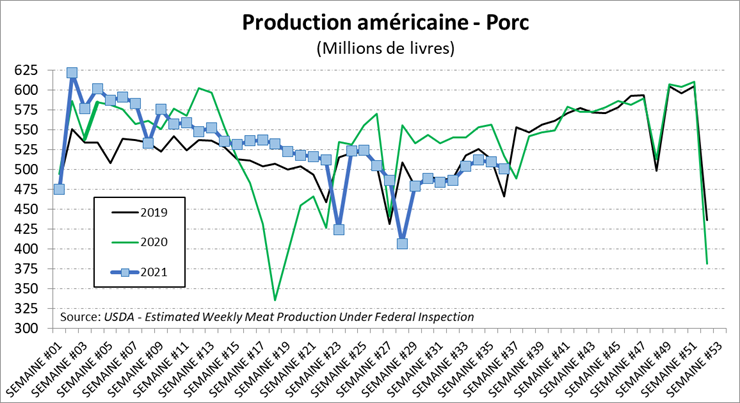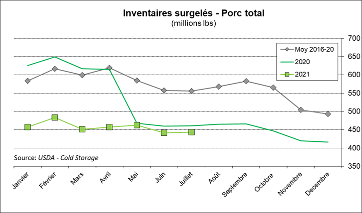 L'abattage de juillet-août représentait 44,9 % du troupeau au 1er juin, par rapport à une moyenne 2015-2019 d'environ 45,3%, ce qui suggère que l'USDA a peut-être surestimé l'inventaire du 1er juin jusqu'à un million de têtes. Il n'y a aucune indication que la vitesse réduite des lignes d'abattage qui est entrée en vigueur au début de juillet, ou des problèmes de main-d'œuvre, ont restreint les abattages puisque le poids des porcs continue d’être inférieur à l'an dernier, contribuant encore à une réduction de l’offre de porc à court terme. Le total des stocks de porcs congelés aux États-Unis à la fin de juillet était inférieur de 3,8 % à un an plus tôt et était le plus petit depuis 2010. Il y aura donc plus d'espace de congélation disponible pour absorber l'augmentation de la production porcine de l’automne.