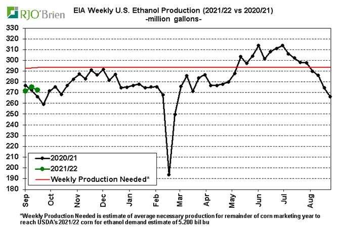 Actuellement la production d’éthanol est plutôt faible à 275 millions de gallons par semaine. Mettons en perspectives : l’USDA prévoit 5.2 milliard de boisseaux de maïs pour l’éthanol. Disons que chaque boisseaux de bedingue donne 2.9 gallon d’éthanol, on obtient environ 15 milliard de gallon d’éthanol par année, ou un peu moins de 300 millions par semaine. C’est des gros chiffres, des millions pis des milliard, mais ce qu’il faut retenir c’est 1) au rythme actuel on est en dessous du rythme requis pour atteindre la cible de 5.2 milliard et 2) la politique/lobby s’invite au party dans un but de moins produire, possiblement. On est en début de saison, il ne faut pas capoter, mais on a besoin d’un coup d’pouce, pas d’un coup d’massue!