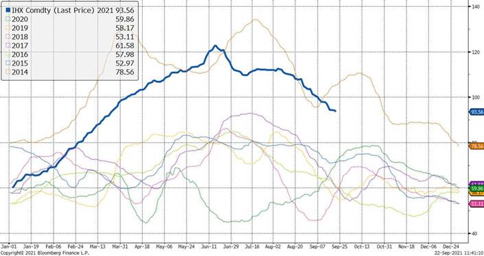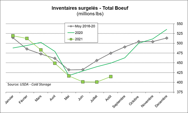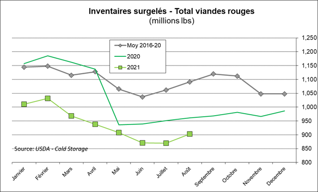 Le USDA rapportait les données de Cold Storage hier. Au 31 août, les inventaires de viandes de porc se situaient à 460 millions de livres aussi de 4% par rapport à juillet, mais en baisse de 1% par rapport à août 2020. Par conséquent, les stocks ne trouvent toujours une tangente positive et plus le temps avance et plus on s’habitue à conserver des stocks très serrés.