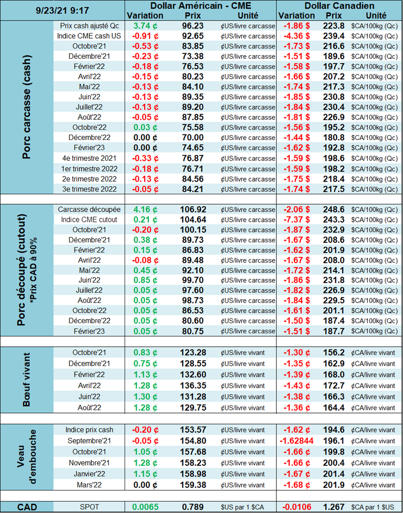 Le porc cherche aussi une certaine stabilité au niveau des prix. Le niveau de support sur les contrats de décembre tiennent bon autour de $72.00 USD / 100 livres. Il faut souligner que l’écart entre le prix de contrat d’octobre et le contrat de décembre est encore une fois relativement large. Le prix au comptant continue sa course pour rejoindre le contrat d’octobre. Le prix au comptant se situait hier @ $92.17. L’écart se rétrécie jour après jour, mais se situe encore autour de $10.00 avec 3 semaines à faire avant l’expiration.