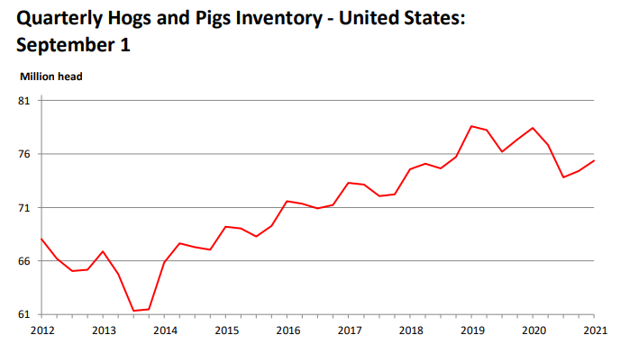 Vraisemblablement, le prix du porcelet qui est présentement élevé en cette période de l’année (70 $US/porcelet de 40lbs) n’y est pas pour rien. Le nombre de mise-bas fût extrêmement faible durant l’été et par conséquent, le nombre de porcelets aux États-Unis affiche un gros déficit par rapport l’an dernier. Voici les grandes lignes du rapports qui est définitivement positif pour les prix à Chicago :