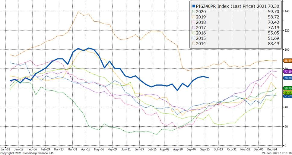 - Porcs de 120 à 179 lbs et porcs de >180lbs : environ 1.3% de moins que l’an dernier, c’est donc moins positif pour le prix du contrat d’octobre