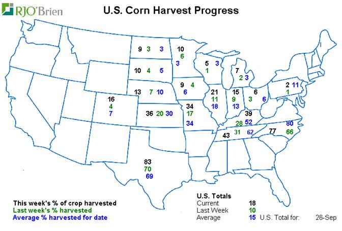 - Récoltes maïs U.S. : 18% complété aux USA (15% en moyenne à ce temps ci)