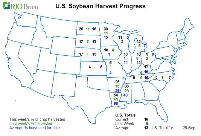 - Récoltes soja U.S. : 16% complété aux USA (6% en moyenne à ce temps ci)